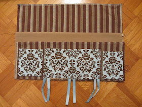 All pieces were double thickness (yes, this became interesting eventually - I ignored her instructions to get a jeans needle into my machine. Jeans needle?  Don't have one).  The striped piece was the back / base (with a plain back lining).  The middle-level pocket would be for stored money (float & incoming larger bills), the front pocket for accessible cash.  The longer rectangular patterned piece with ribbons is sewn up the middle to split it into two, and is for the loonies & twonies.  One wee pocket was for my cell phone, and the other was for business cards or my pocket watch.  Below is my first layout.  Before I realized oh yeah, seam allowances.